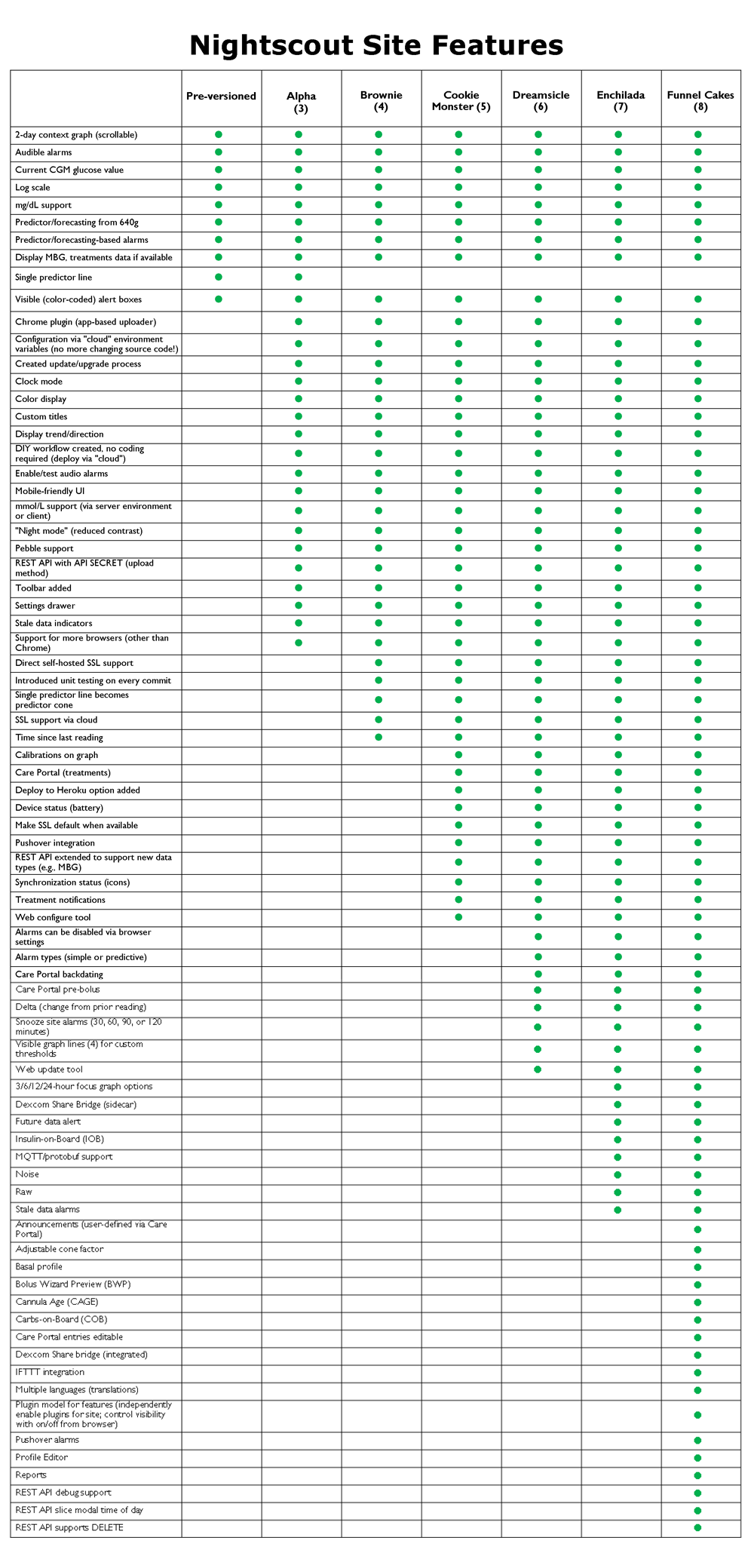 With the release of Funnel Cake, a large number of new features and a plugins architecture was introduced to Nightscout users. The following graphic tracks the history and evolution of Nightscout website code by features introduced with the major releases.