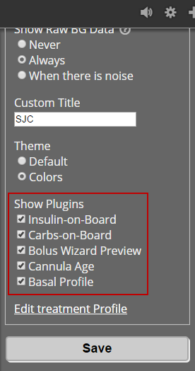 Once plugins are enabled, some of them have pillbox visualizations which can appear as part of your site. In your browser, you can choose which plugins you wish to view by checking the boxes next to the ones you want to see and clicking save. For example, if you enable Carbs-on-Board and choose to display it (in the browser settings panel), you will see a pillbox for COB. At any point, you can open the browser settings panel and turn the visibility of specific plugins on or off.